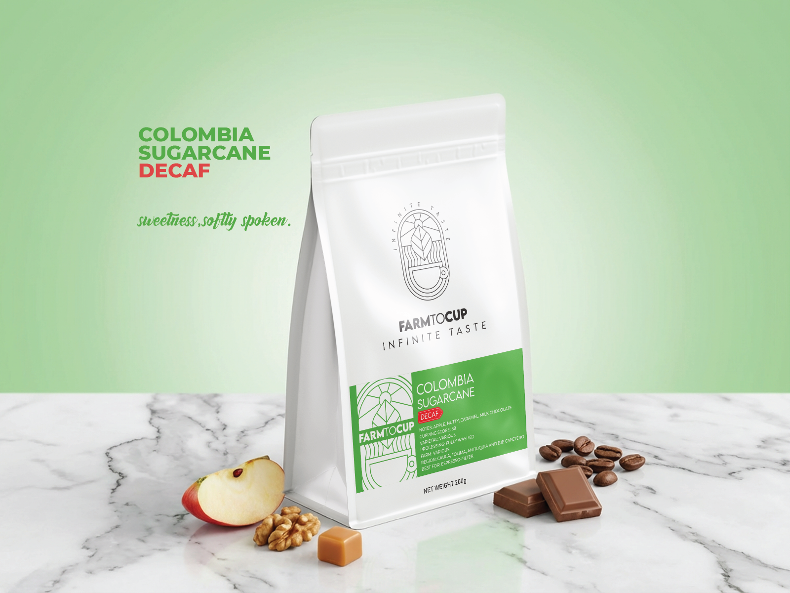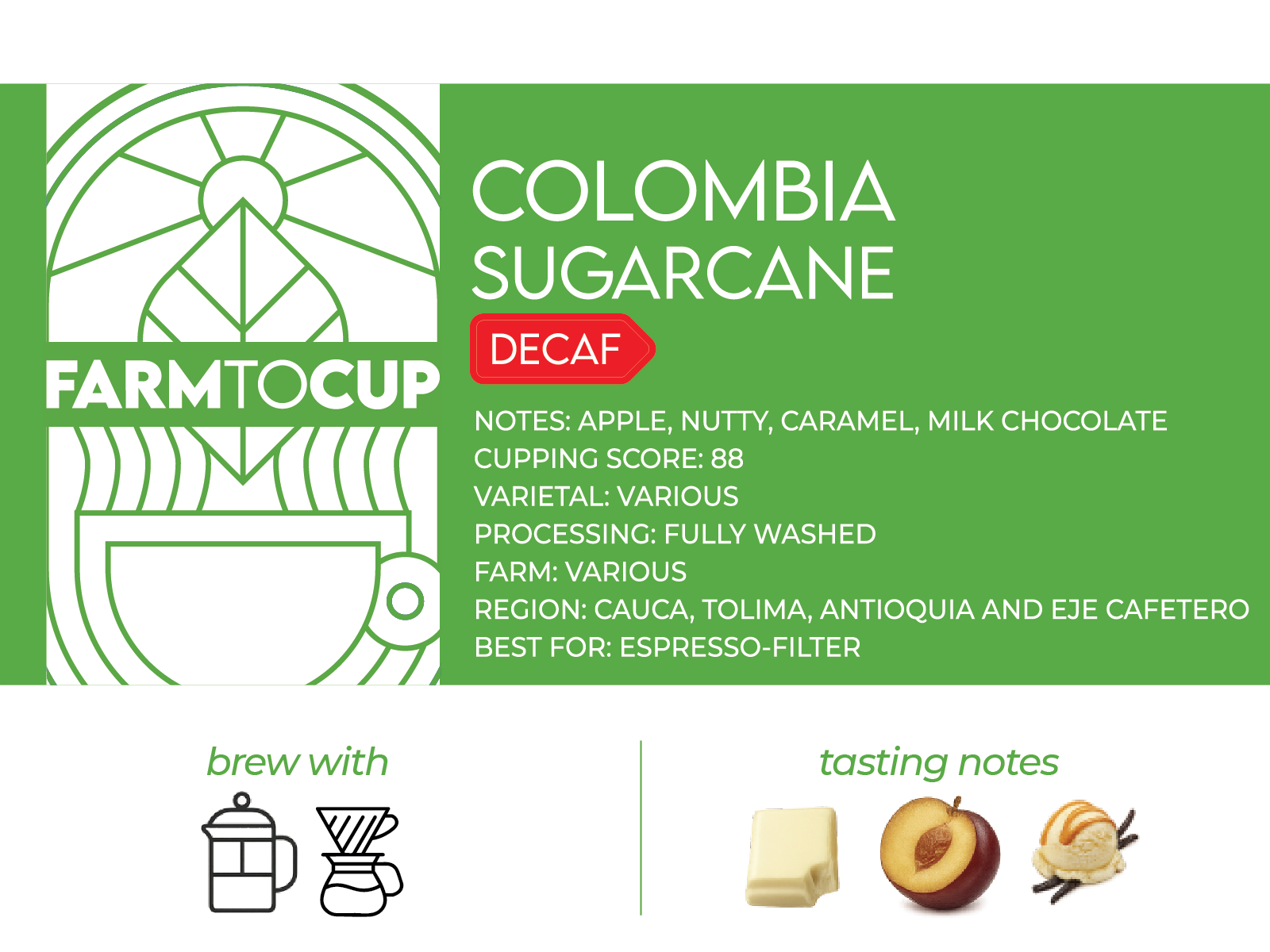 Notes: Apple, Nutty, Caramel, Milk Chocolate Cup Score: 88 Varietal: Various Process: Fully Washed, Sugarcane Decaf Farm: Various Region: Cauca, Tolima, Antioquia, Eje Cafetero, Colombia Best for: Espresso, Filter