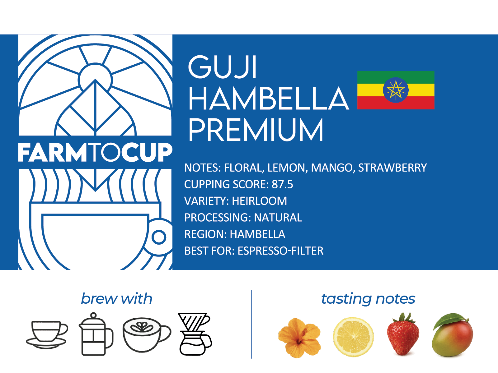 Notes: Floral, Lemon, Mango, Strawberry Cup Score: 87.5 Variety: Heirloom Process: Natural Region: Hambella, Ethiopia Best for: Espresso, Filter